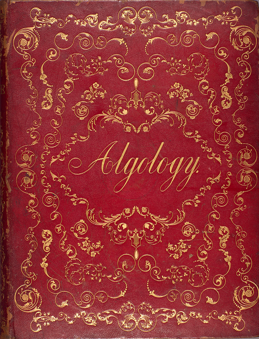 Elaborately bound in red leather, Algology is embossed with gold cursive lettering and gold flourishes that visually echo the shapes of the seaweed specimens mounted in the book.