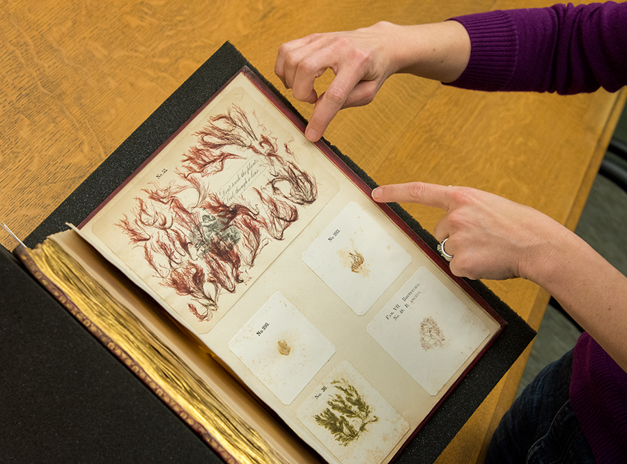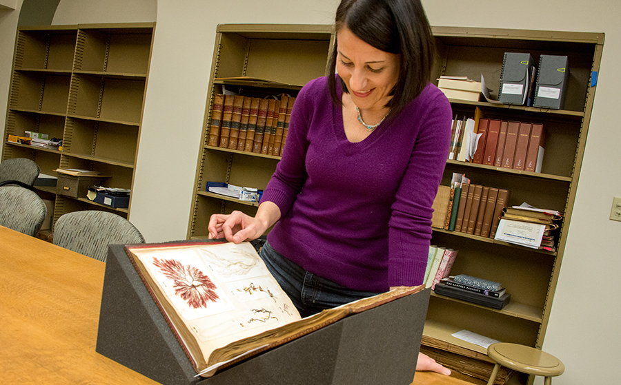 Michele Navakas—assistant professor of English and affiliate of American Studies at Miami University of Ohio, and a 2017–18 National Endowment for the Humanities fellow in residence at The Huntington—examines the astonishing range of seaweed colors and textures in Algology , well preserved more than a century and a half after author Charles F. Durant prepared the volume. Photograph by Kate Lain.