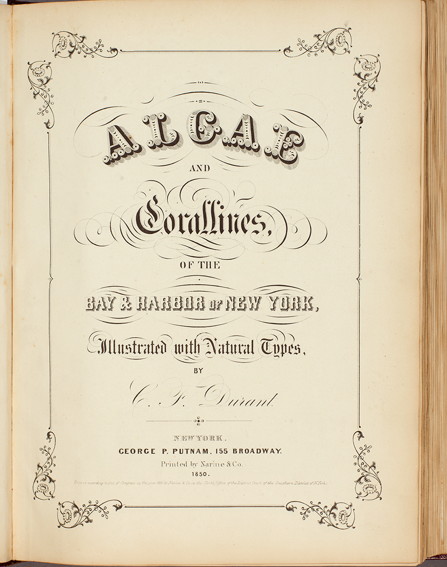 Durant’s decorative title page for Algology bears the text’s official title, Algae and Corallines, of the Bay & Harbor of New York. Illustrated with Natural Types.
