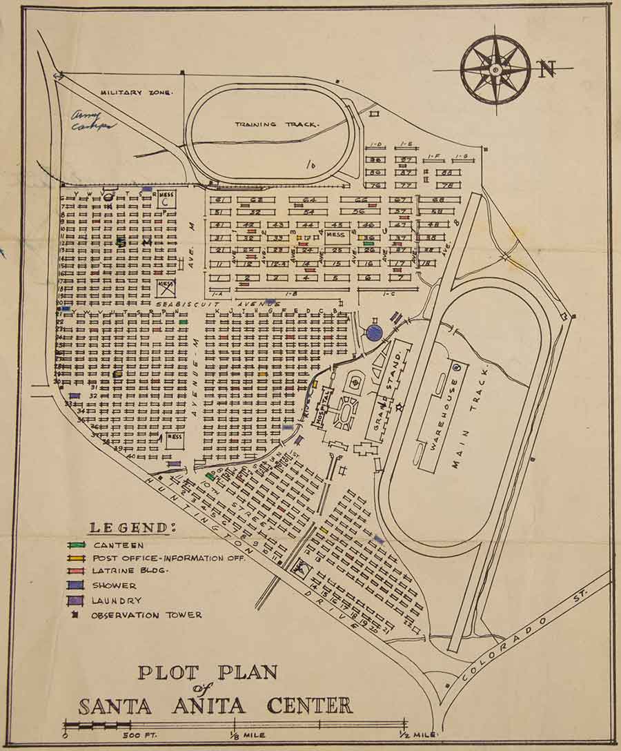 Plot plan of the Santa Anita Assembly Center, 1942, Arthur Ito papers. Assembly centers were created to house Japanese Americans temporarily until they could be transported to internment camps. The Santa Anita racetrack in California was one of the largest assembly centers in the nation, housing approximately 18,000 Japanese Americans. The Huntington Library, Art Museum, and Botanical Gardens.