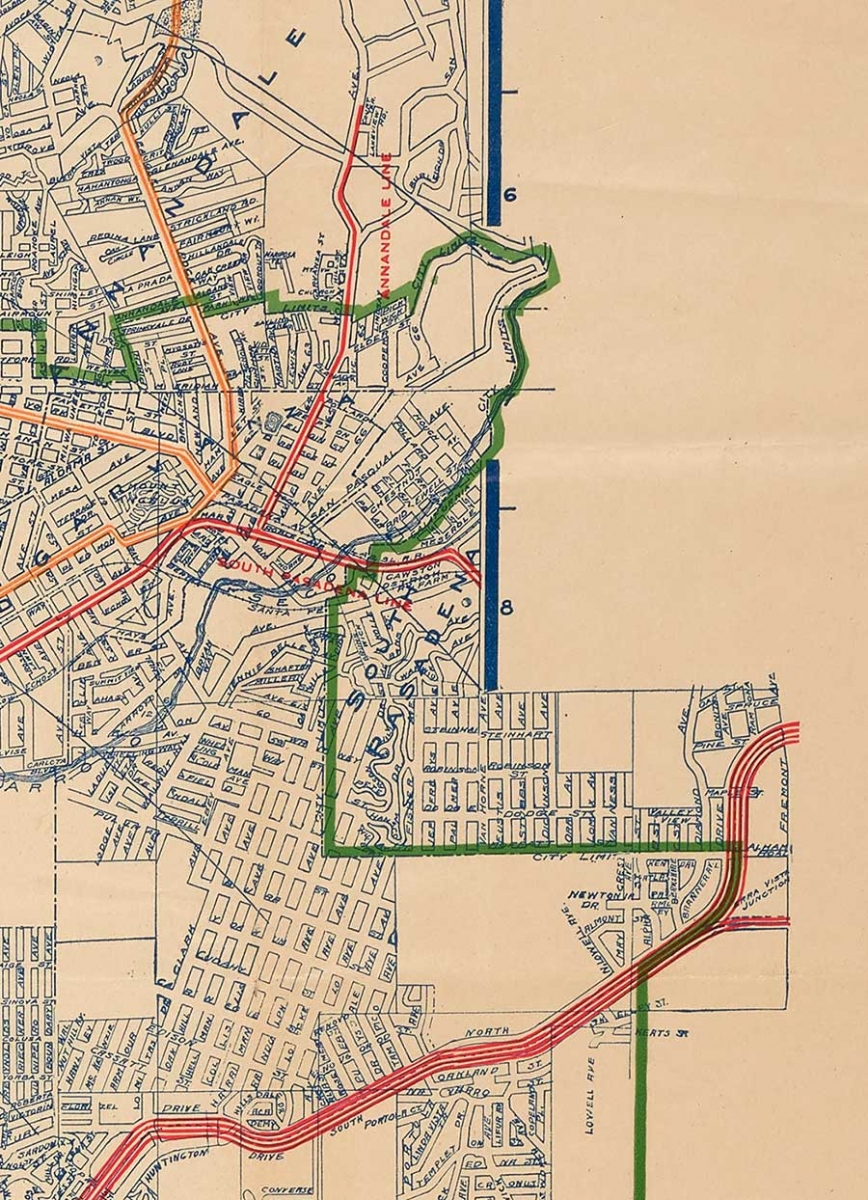 The feature that stands out most on the map, after the red-and-yellow rail systems, is the angular green line designating the official limits of Los Angeles. It seems to have been drawn less to emphasize boundaries and more to demonstrate how the city ignores and exceeds them. This sense of accelerating expansion is bolstered by the circular tracings that emerge from downtown like rings on a pond. Noticeable in other turn-of-the-century maps, their practical purpose is to designate radial distance, in this case, from city center. However, Whitlock extended her circles all the way to the map’s edge, as if her Los Angeles not only has a pulse, but is alive and kicking. Or perhaps they’re not separate rings but one giant train wheel, whooshing by. In any case, the design further underscores a link between transit and the current and future geographic and financial growth of the metropolis.