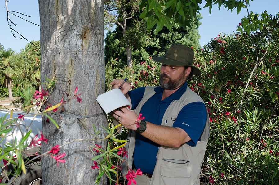 Daniel Goyette, The Huntington's arborist, measures the circumference of a diseased Liquidambar's trunk and takes notes on its condition before the tree is removed. Yellow stains on the trunk indicate the presence of the destructive Fusarium fungus introduced by the polyphagous shot hole borer, a tiny invasive beetle. Photograph by Lisa Blackburn.