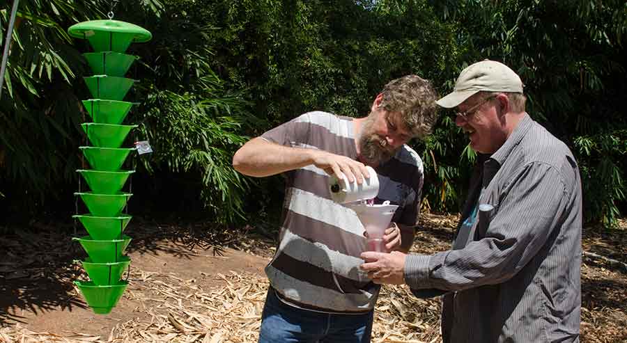 Tim Thibault (left), curator of woody plant materials at The Huntington, and Richard Stouthamer, entomologist at University of California, Riverside, collect polyphagous shot hole borers from odor-emitting funnel traps to estimate the size of their population. Photograph by Lisa Blackburn.