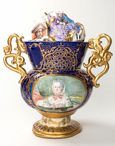 A sculptor and porcelain production assistant, Wisdom developed new work in response to The Huntington's significant 18th-century French porcelain collection. Emulating the Sèvres porcelain manufactory's techniques with both traditional and new materials, Wisdom's work explores the role of women at Sèvres, where they served as both patrons of—and often uncredited makers in—the manufactory. Wisdom created vessels and a wig stand with depictions of women of class and privilege sharing space with women on society's margins. The images create both tension and connection between her subjects. In this way, the artist builds narrative bridges between historical figures who never met, imagining a world in which empathy and empowerment flows both ways.