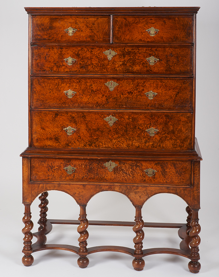 High chest of drawers, about 1710, possibly New York. Walnut, yellow pine, eastern white pine, burl ash veneer, and brass, 57 ¼ x 39 x 20 ½ in.