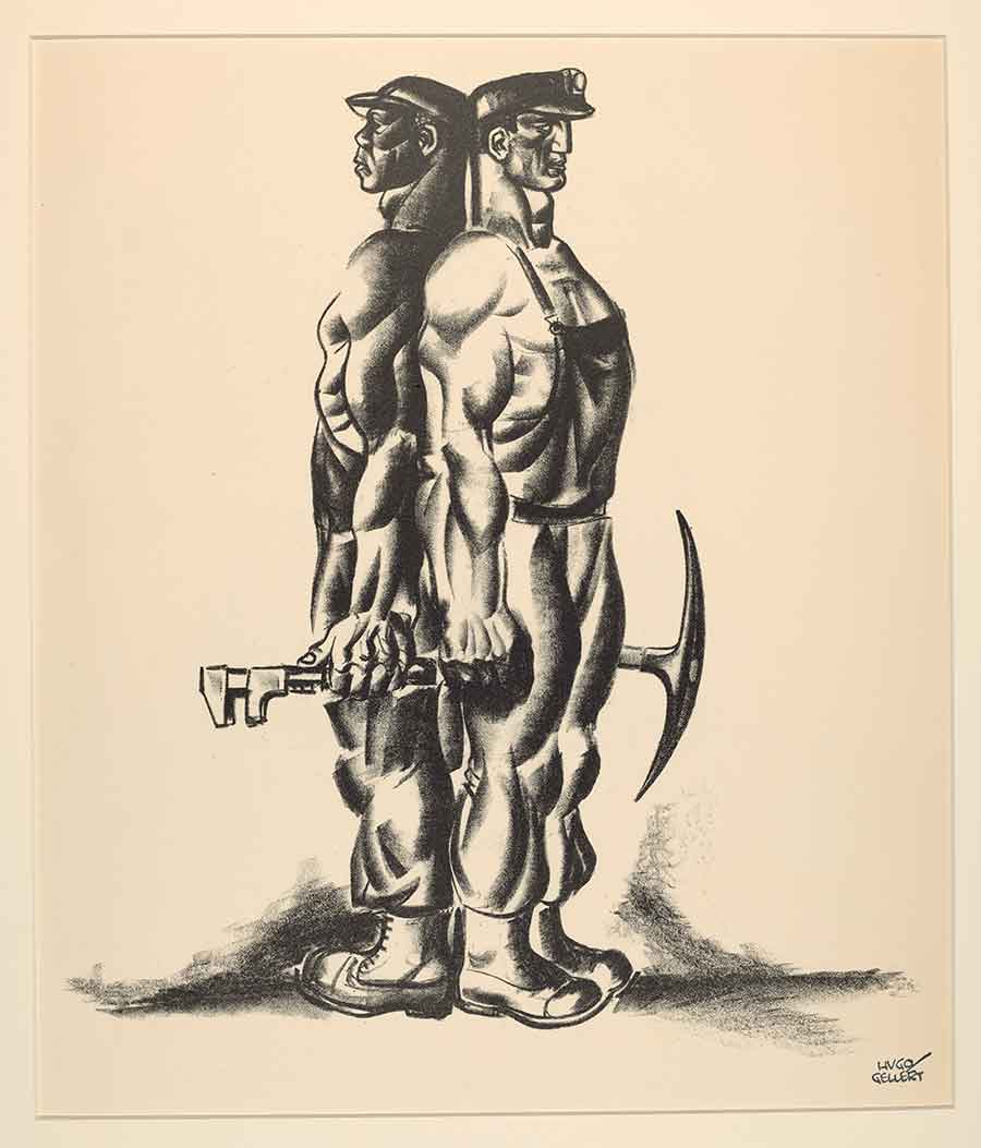 Hugo Gellert, The Working Day 37, 1933. © Hugo Gellert; Courtesy of the estate of the artist and Mary Ryan Gallery, New York. Lithograph, 22 5/8 x 15 3/16 in. (57.5 x 38.6 cm.). This image highlights Gellert’s lithographic talent and reflects his advocacy of racial equality and solidarity.