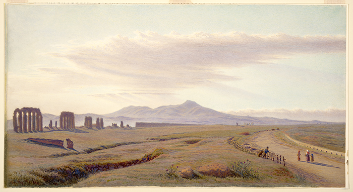 Blunden’s serene panorama is interrupted only by an ancient aqueduct that parallels a country road. The mood of her watercolor was echoed by the novelist Charles Dickens, who visited the same site in the mid-19th century. He wrote: “Here was Rome indeed at last…. Except where the distant Apennines bound the view upon the left, the whole wide prospect is one field of ruin. Broken aqueducts, left in the most picturesque and beautiful clusters of arches.”