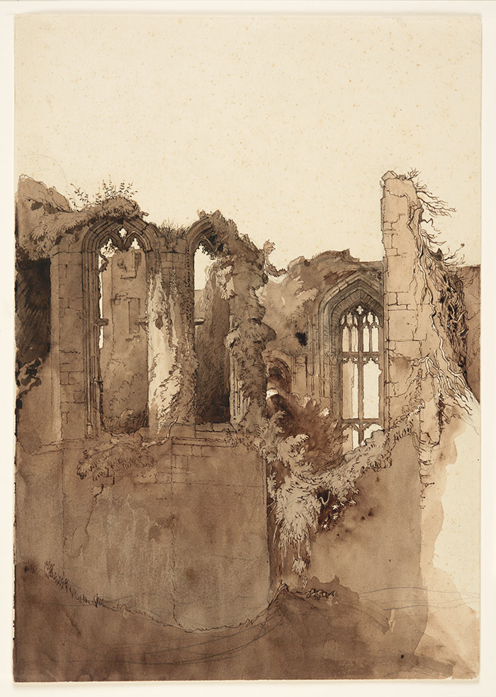 British artists also flocked to ruins on their home turf. John Ruskin (1819-1900) created a haunting image of Kenilworth Castle—a palace constructed from Norman through Tudor times in central England. The skeletal remains of the abandoned estate appear melancholy as ivy slowly overtakes them. In addition to his artistic pursuits, Ruskin was a prolific and influential writer. He addressed an array of subjects, ranging from architectural aesthetics to geology to conservation. Ruins allowed him to simultaneously indulge his passions for nature and architecture. For many of the crumbling buildings, the barrier between interior and exterior has almost been eliminated, blurring the distinction between the natural and built environment.