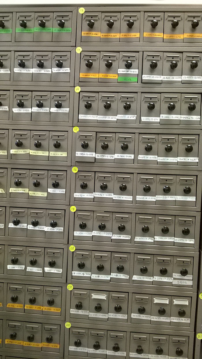 Slide filing cabinet, biomedical laboratory, 2016. Photo by Soraya de Chadarevian.