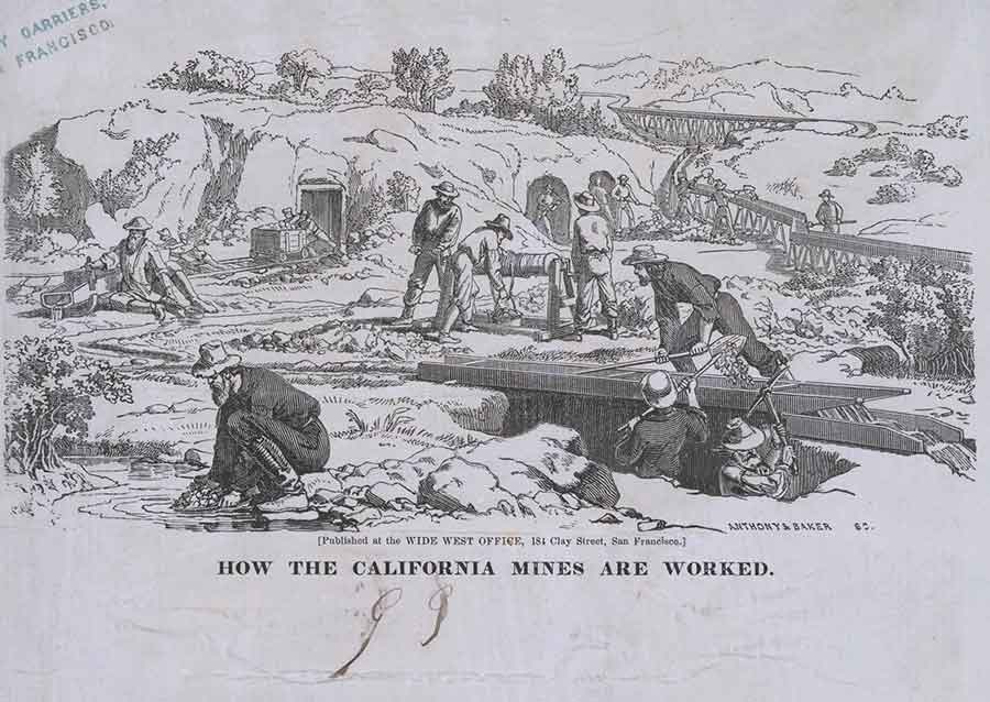 The letter sheets that depicted gold mining in all its permutations emphasized certain common features that characterized that occupation throughout its early years. Above all, they highlighted the staggering amount of physical labor required. Even the simplest means of mining demanded constant bending, shoveling, hauling, and pulling to extract even the tiniest amount of precious metal, leading many miners to compare themselves wryly or bitterly to ditch diggers and brick layers as they suffered aches and pains and illnesses they had never associated with fortune hunting. The Huntington Library, Art Museum, and Botanical Gardens.