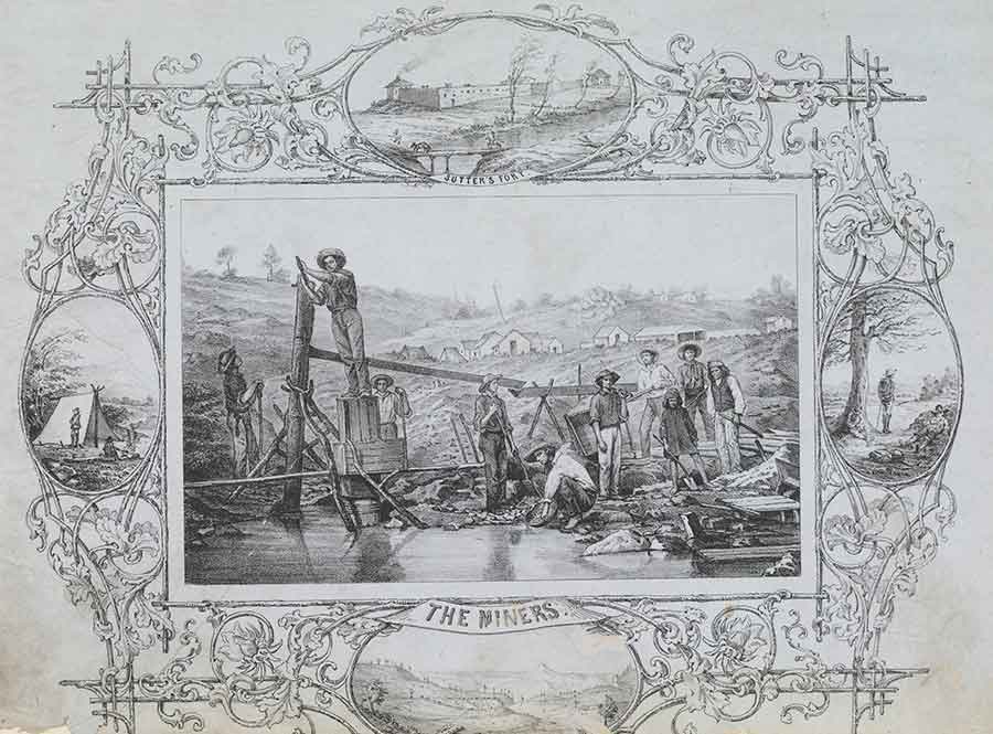 Hoping to capitalize on every miner’s desire to share news of life in California with friends and loved ones, various entrepreneurs in the fields of printing and publishing commissioned individuals skilled with pencil, pen, or brush to capture different aspects of life in the Golden State. Engravers and lithographers then copied the original images onto wood or stone surfaces used in printing presses to duplicate copies by the hundreds or thousands. Reproduced on sheets of paper as large as 11 by 17 inches and then folded in half, the resulting items were sold as illustrated stationery.