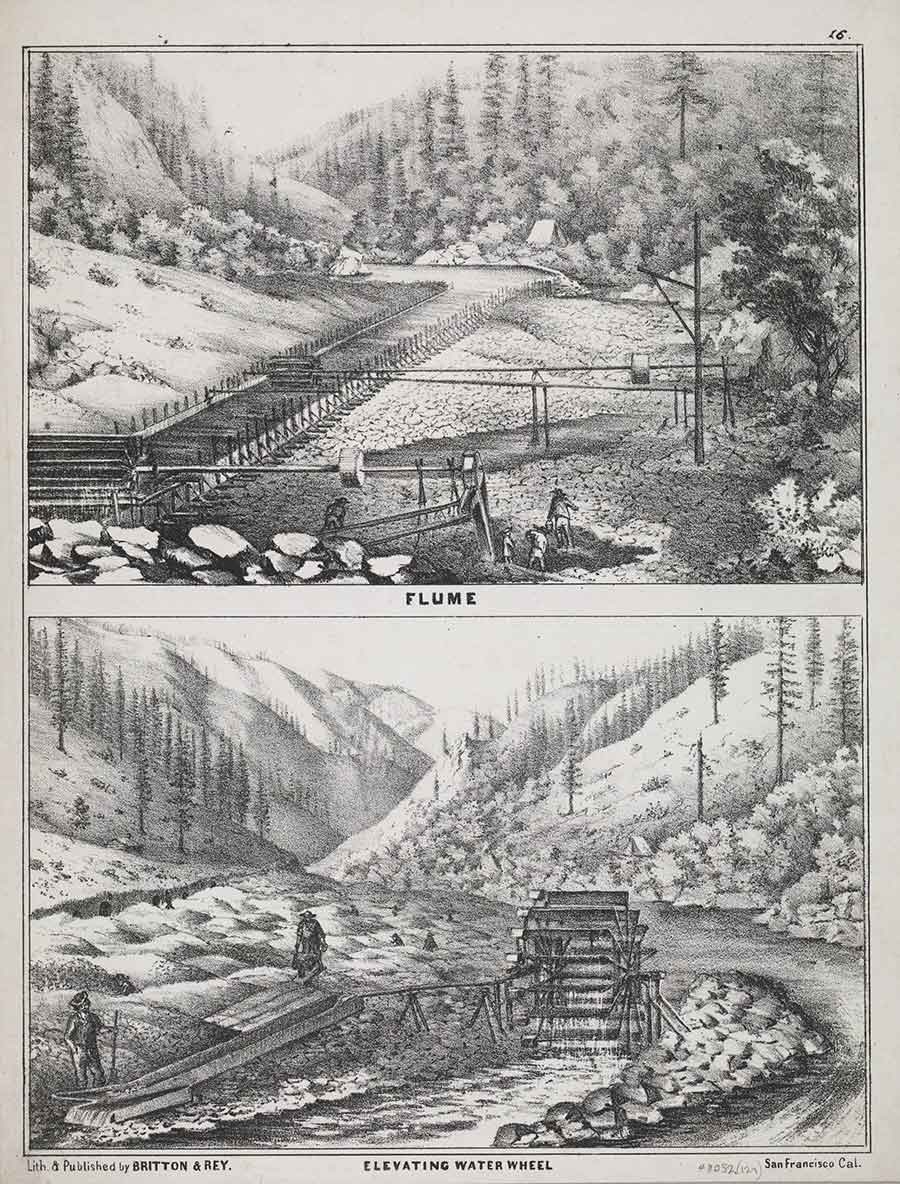 Elaborating upon the application of running water to gold-bearing soil, some ambitious miners constructed large wooden channels, known as “flumes,” to carry great quantities of water to gold mining sites. Surging through those artificial waterways with great force, the resulting torrents spun wheels, turned axles, and ran pulleys to replace muscle power with its mechanical equivalent. The Huntington Library, Art Museum, and Botanical Gardens.