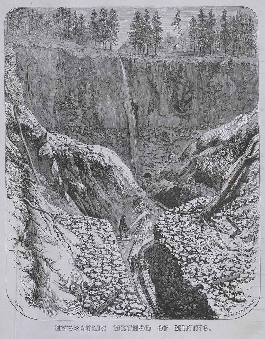 By the middle of the 1850s, the quest for gold had become the driving force behind the devastation of great tracts of California’s landscapes. Huge patches of riverbanks and hillsides had been torn open and the soil fed into rockers, cradles, sluices, and canals in hopes that it would be washed down to golden particles. Entire forests were cut down to stumps, supplying the lumber required for flumes, water wheels, coffer dams, and underground shoring—the essential infrastructure of industrial-scale mining.