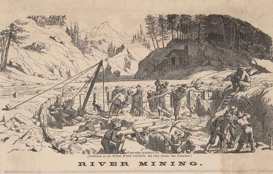 Gold was discovered along the American River, approximately 50 miles from present-day Sacramento, on Jan. 24, 1848. Within a year, thousands of gold seekers from many corners of North and South America stampeded into the gullies and canyons of the Sierra Nevada. Amateurs all, they soon grasped how the rushing water that filled the region’s creeks, streams, and rivers every winter and spring had carved away at the surrounding heights over great stretches of time. Experimenting with the accumulated debris brought down from mountain slopes, they learned that water swirled in metal pans containing shovelfuls of sand and gravel would carry away the refuse and leave behind weightier flakes of gold.