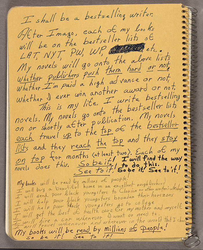 Handwritten notes on inside cover of one of Octavia E. Butler’s commonplace books, 1988. Octavia E. Butler papers. The Huntington Library, Art Collections, and Botanical Gardens. Copyright Estate of Octavia E. Butler.