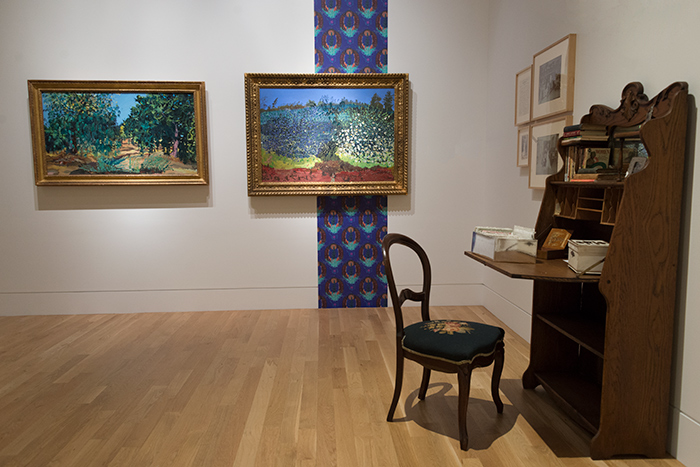 In one section of "COLLECTION/S," paintings and wallpaper made by Sarita Dougherty are installed adjacent to items related to Kiki Loveday's archive of LGBTQ letters and love stories. Photo by Kate Lain.