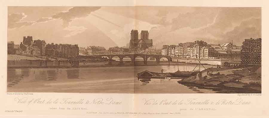 Thomas Girtin, “View of Pont de la Tournelle and Notre Dame,” etching and aquatint, plate 11 from A selection of twenty of the most picturesque views in Paris, and its environs drawn and etched in the year 1802 . . . and aquatinted in exact imitation of the original drawings (London: M.A. & J. Girtin, 1803). The Huntington Library, Art Collections, and Botanical Gardens.