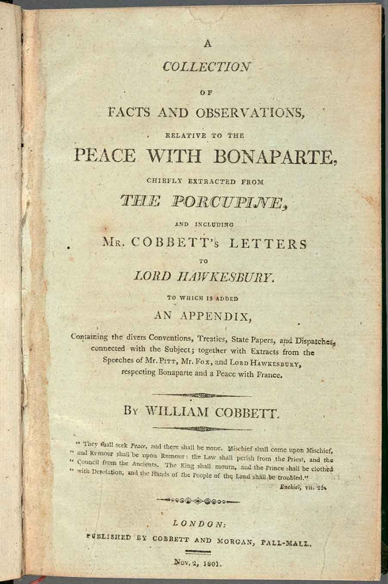 William Cobbett (1763–1835), title page of  A Collection of Facts and Observations, Relative to the Peace with Bonaparte . . . (London, 1801). The Huntington Library, Art Collections, and Botanical Gardens.