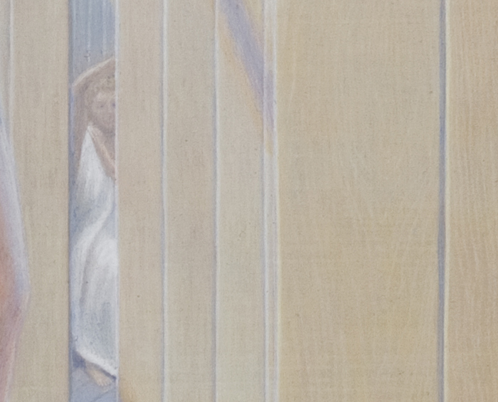 A figure that can be seen only as a sliver inside the bathhouse seems to be investigating viewers. George Tooker (1920–2011), detail from Bathers (Bath Houses), 1950, egg tempera on gessoed board. The Huntington Library, Art Collections, and Botanical Gardens. Copyright Estate of George Tooker, Courtesy of DC Moore Gallery, New York.