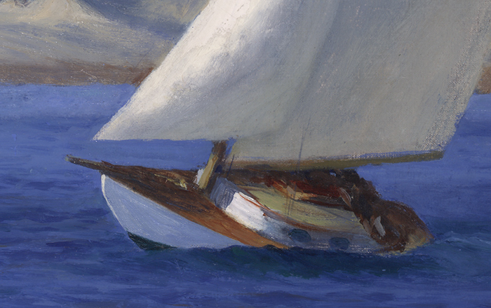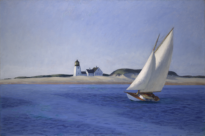 No one can be seen enjoying the fine weather, not even on the boat itself. Edward Hopper (1882–1967), detail from The Long Leg, ca. 1930, oil on canvas. Gift of the Virginia Steele Scott Foundation. The Huntington Library, Art Collections, and Botanical Gardens.