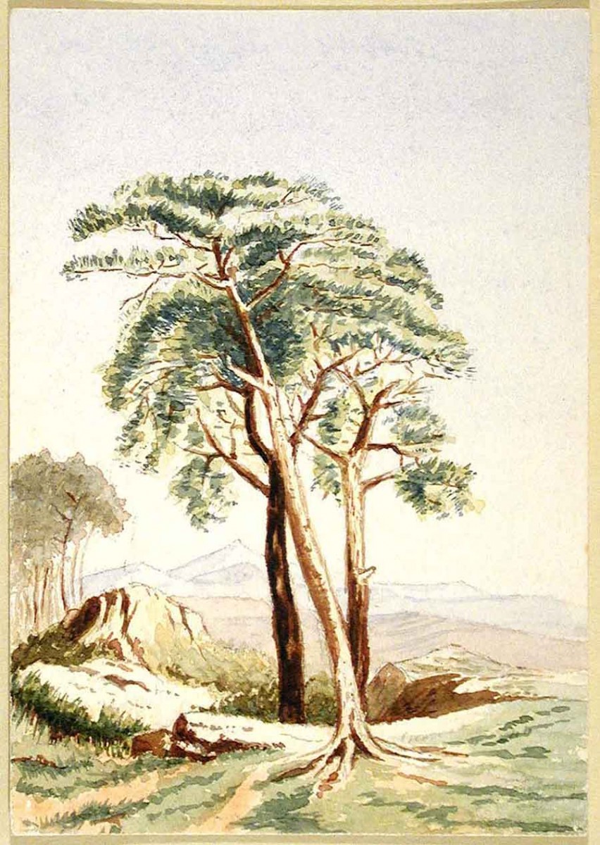 Joseph Basil Girard, Landscape with Trees, Oct. 15, 1890, watercolor on paper, 5 x 3 1/2 in. (12.7 x 8.9 cm.), purchased with funds from the Virginia Steele Scott Foundation. The Huntington Library, Art Museum, and Botanical Gardens.