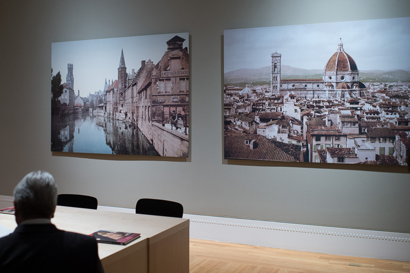 Cityscapes of Bruges (left) and Florence are reproduced in "Face to Face: Flanders, Florence, and Renaissance Painting," on view in the Boone Gallery through Jan. 13.