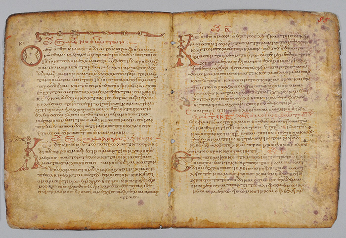 This view of part of the Archimedes Palimpsest shows the prayer book orientation pf the manuscript pages (leaves 55v–50r). Copyright the owner of the Archimedes Palimpsest, licensed for use under Creative Commons Attribution 3.0 Unported Access Rights.