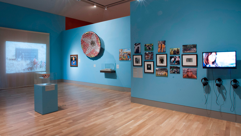 “Contemporary Voices” is just a few steps away from a striking example of Indian identity: a ceremonial basket crafted by Linda Yamane, a Rumsen artist. The basket exterior is deep red and white and made of willow, sedge, bird feathers, and olivella-shell beads. Completed in 2012, the basket took Yamane more than two years to make and is believed to be the first basket of its kind created in more than 200 years. It contains 12,500 stitches, 110 willow sticks, approximately 400 sedge strands, and a 60-foot coil. The basket is a remarkable transformation of natural materials into an object that resonates beyond the everyday.