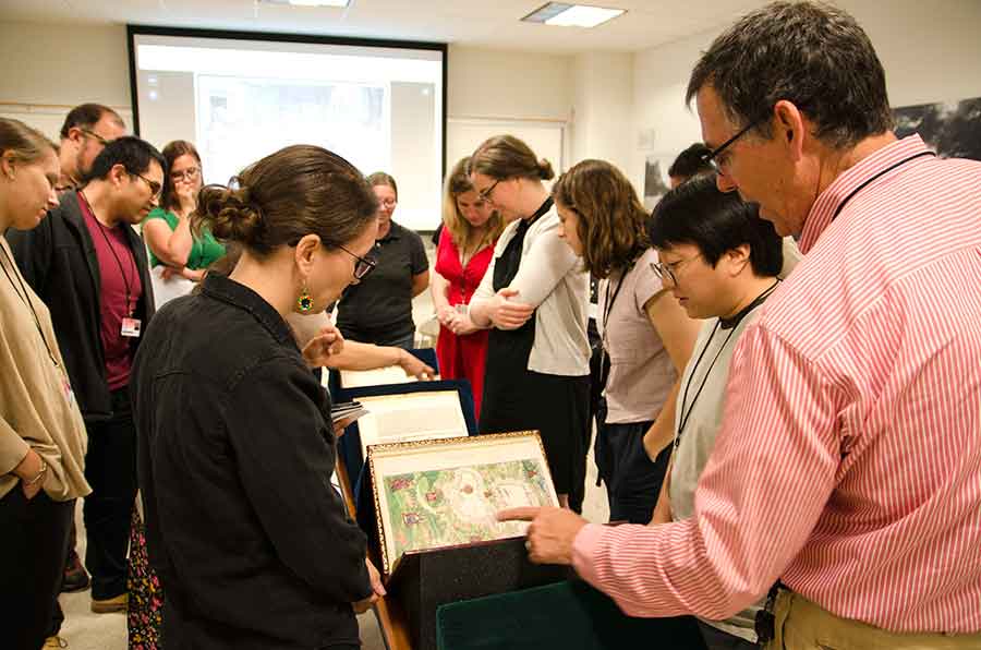 Participants in The Huntington’s first residential summer institute in the history of science, technology, and medicine gather around Daniela Bleichmar, professor of art history and history at the University of Southern California, to take a close look at some of the Library’s visual resources regarding natural history and Latin America. Photo by Lisa Blackburn.