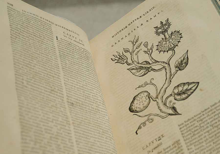 Passionflower, woodcut, in Juan Eusebio Nierenberg’s Historia naturae, maxime peregrinae, Antwerp, 1635. Photo by Lisa Blackburn.