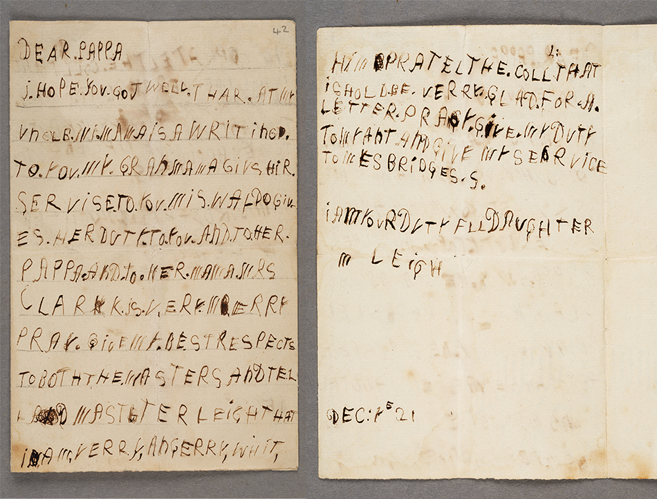 If you read the letter aloud, you might think it was written by a young woman responsible for maintaining personal connections within her family and wider social network, as the contents are filled with mentions of “grandma” and “mama” sending their “service” to her father. But to see the words written in the hand of a girl taking her first steps toward literacy is charming.