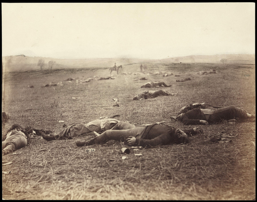 Battle-Field of Gettysburg. View on the Field after Fight of First Day, July 4, 1863 (printed later); also known as “Harvest of Death.” Timothy H. O’Sullivan (ca. 1840–1882), photographer; printed by Alexander Gardner (1821–1882) in the two-volume work Gardner’s Photographic Sketchbook of the War(1865–66). Huntington Library, Art Collections, and Botanical Gardens. This week we mark two notable anniversaries—the signing of the Declaration of Independence (July 4, 1776) and the Battle of Gettysburg (July 1–3, 1863). By evoking the events of 1776 at the dedication of Gettysburg’s Soldiers’ National Cemetery in November 1863, Lincoln was challenging Americans to remember the importance of both events—one having to do with the establishment of a Union, the other with its preservation.