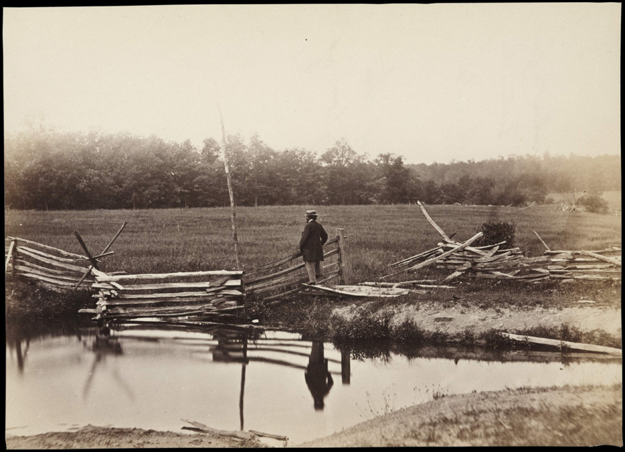 Wheatfield in Which General Reynolds Was Shot, Gettysburg, July 1863 (printed later), attributed to Egbert Guy Fowx (born ca. 1821) for Mathew B. Brady (1823–1896). Photographer Mathew Brady strikes a contemplative pose at the edge of the sprawling wheat field where 7,500 had recently perished. Huntington Library, Art Collections, and Botanical Gardens.The famous “Harvest of Death,” by photographer Timothy H. O’Sullivan, captured the immediate aftermath of battle in gruesome detail and soon became a symbol of the war’s dreadful toll. By the time celebrated Civil War photographer Mathew Brady posed at battlefield’s edge a mere two weeks later, Gettysburg had already become firmly lodged in national memory. And a third image features John B. Bachelder, the site’s first official historian and monument advocate, standing next to Union veterans at Gettysburg around 1887. Two decades removed from battle, the men are citizens of a country that had endured well past a century and counting.