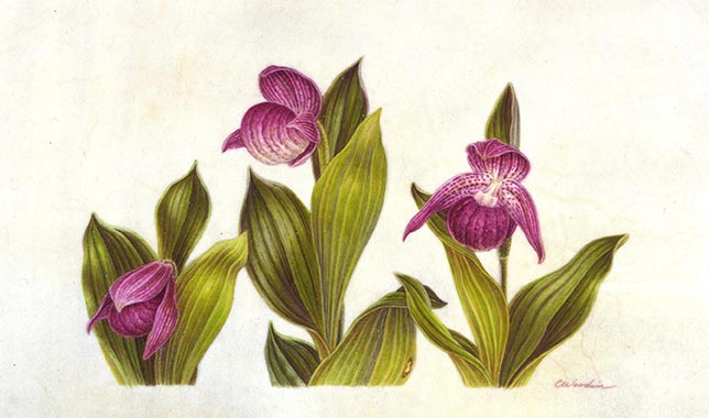 Carol Woodin (b. 1956), Cypripedium macranthos. Watercolor on paper, 7 x 11½ in. © 2007 Carol Woodin. Image courtesy of the artist and the Botanical Artists Guild of Southern California.