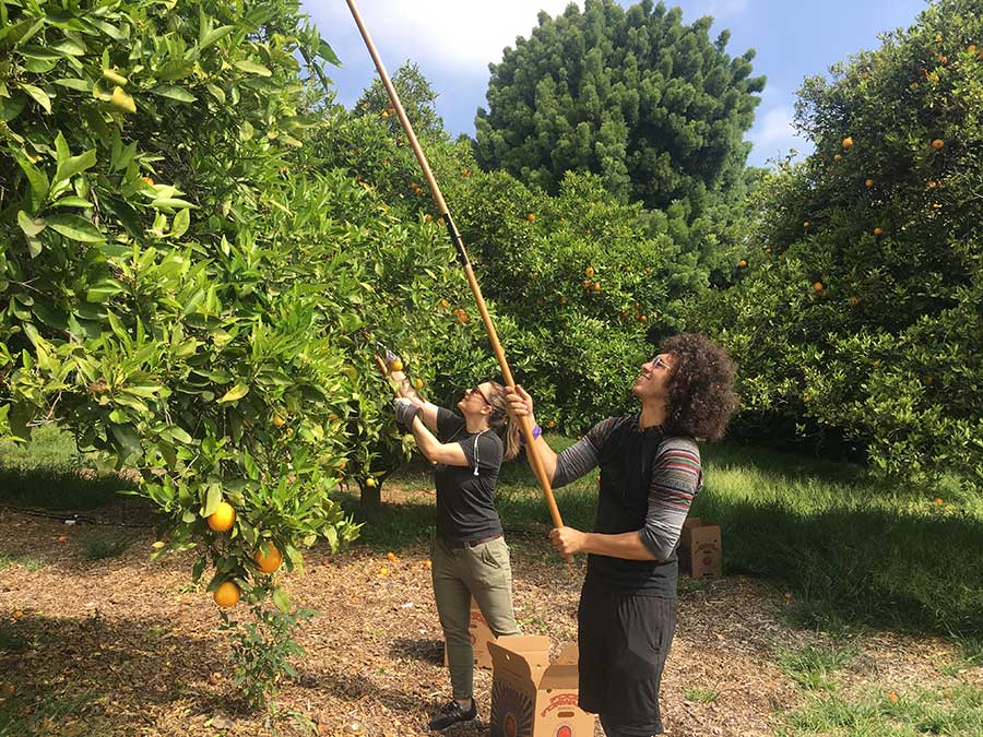 During a recent Saturday morning harvest, 58 volunteers of all ages gathered in the orchard to harvest oranges by hand or with basket pickers attached to long poles. The volunteers stripped the fruit of leaves and stems to reduce the chance of spreading disease-causing pests.