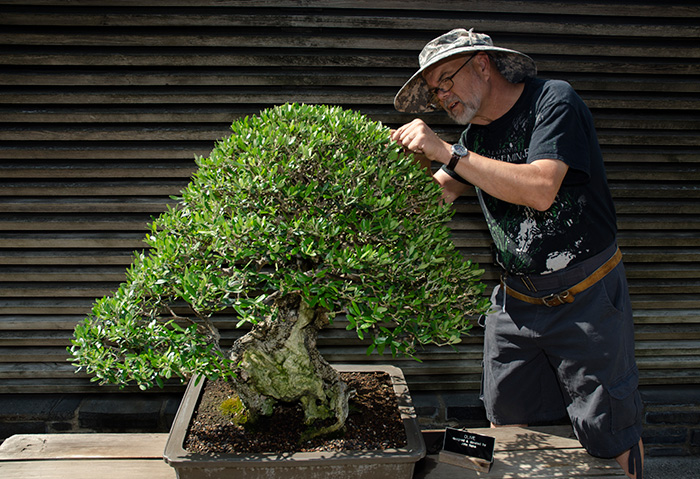 Ted Matson, curator of The Huntington’s bonsai collections, grooms an olive tree designed by the late John Naka. The art of bonsai, says Matson, is like “sculpture with living plant material.” Photo by Lisa Blackburn.