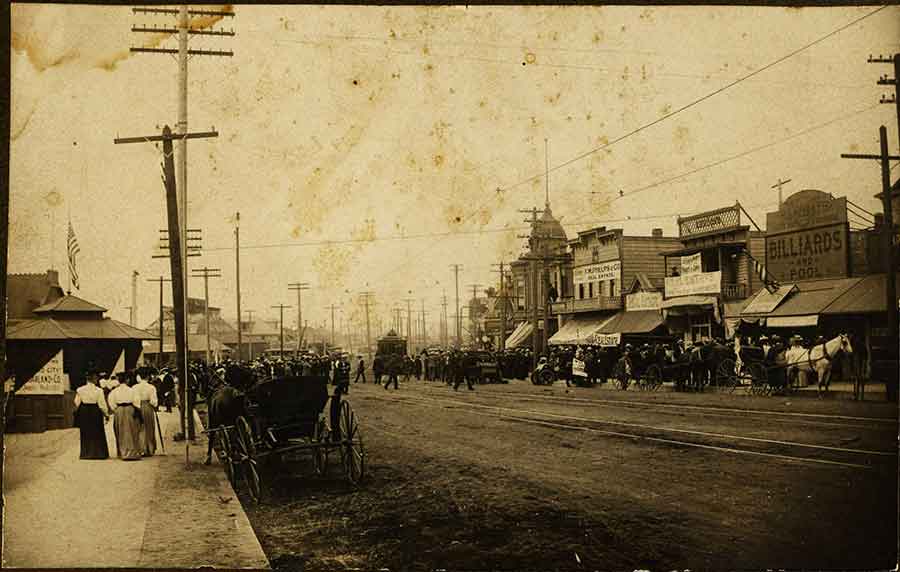 Pacific Avenue in Redondo Beach, California, in the first decade of the 20th century, with an electric street car, horse-drawn wagons, and crowds of people in front of a real estate office. Arguably, Huntington’s most successful real estate venture was Redondo Beach. In 1905, Henry bought 90 percent of Redondo. Four days later, he acquired the existing Los Angeles and Redondo Railway, with 57 miles of track, and added it to the Red Car system. Ernest Marquez Collection. The Huntington Library, Art Collections, and Botanical Gardens.