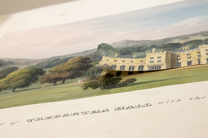 An illustration from landscape architect Lewis Kennedy’s prospectus album, with an overlay showing before and after views. Notitiae of the alterations proposed at Trebartha Hall the seat of F. Hearle Rodd Esqre., Cornwall, Jan. 2, 1815. The Huntington Library, Art Collections, and Botanical Gardens. Photo by Kate Lain.
