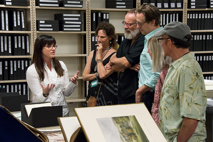Vanessa Wilkie, William A. Moffett Curator of British Historical Manuscripts, shows visitors from A Noise Within Theatre Company selections from The Huntington’s collections relating to the production of Tom Stoppard’s play Arcadia. Left to right: Vanessa Wilkie, Susan Angelo, Geoff Elliott, Eric Curtis Johnson, Alicia Green, and Stephen Weingartner. The Huntington Library, Art Collections, and Botanical Gardens. Photo by Kate Lain.