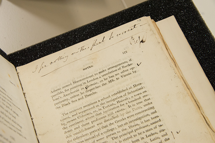Lord Byron’s handwriting in a copy of the seventh edition of his narrative poem Childe Harold’s Pilgrimmage, 1814. The Huntington Library, Art Collections, and Botanical Gardens. Photo by Kate Lain.
