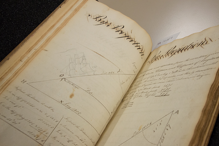 Mathematics manuscript (1820–1832) by Daniel Hallett, in which geometry and trigonometry are used to calculate and solve problems related to sailing directions. The Huntington Library, Art Collections, and Botanical Gardens. Photo by Kate Lain.