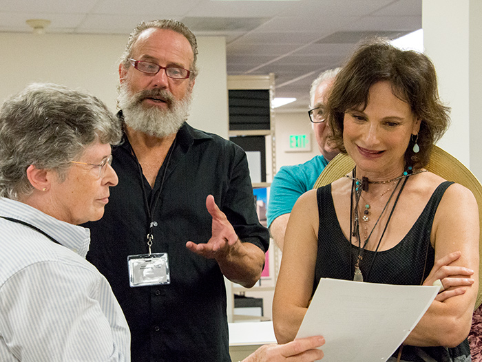 Sara S. “Sue” Hodson, curator of literary manuscripts, shows off an early typed draft of Tom Stoppard’s play Arcadia. Left to right: Sara S. “Sue” Hodson, Geoff Elliott, Mitchell Edmonds, and Susan Angelo. The Huntington Library, Art Collections, and Botanical Gardens. Photo by Kate Lain.