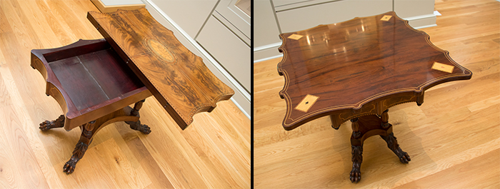 Left: The surface of Card Table has a wavy design that matches the seascape that hangs above it in the gallery. Right: The fully opened Card Table reveals inlaid satinwood playing cards in each corner. Card Table, mid 19th Century. Unknown maker, American. Mahogany with satinwood and holly inlay. The Huntington Library, Art Collections, and Botanical Gardens. Photos by Kate Lain.