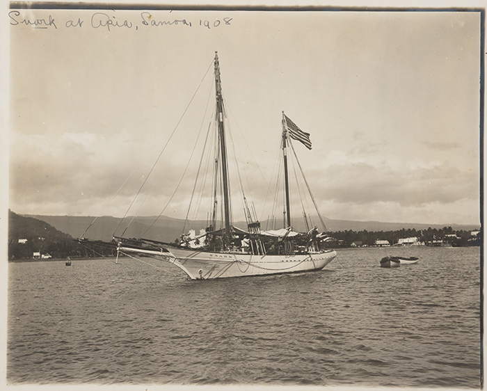 Snark, the vessel on which the Londons and their crew attempted an around-the-world trip, at anchor in Apia, Samoa, 1908. Photo by Jack London. The Huntington Library, Art Collections, and Botanical Gardens. Snark, the vessel on which the Londons and their crew attempted an around-the-world trip, at anchor in Apia, Samoa, 1908. Photo by Jack London. The Huntington Library, Art Collections, and Botanical Gardens.