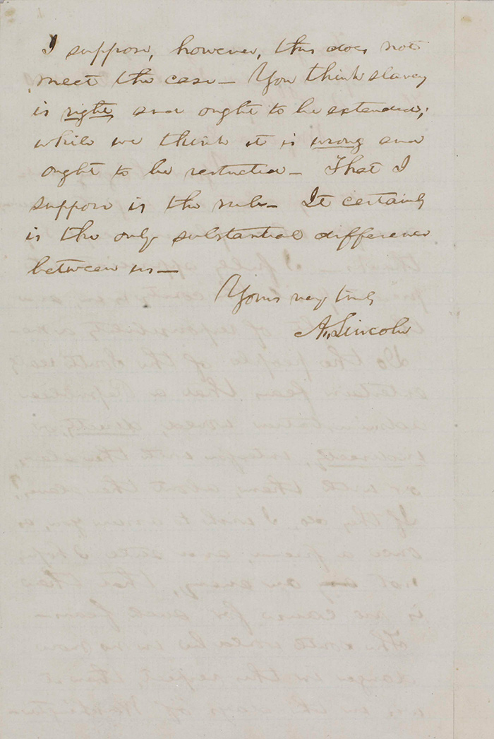 Yet Lincoln makes clears his position: “You think slavery is right and ought to be extended; while we think it is wrong and ought to be restricted. That I suppose is the rub.”