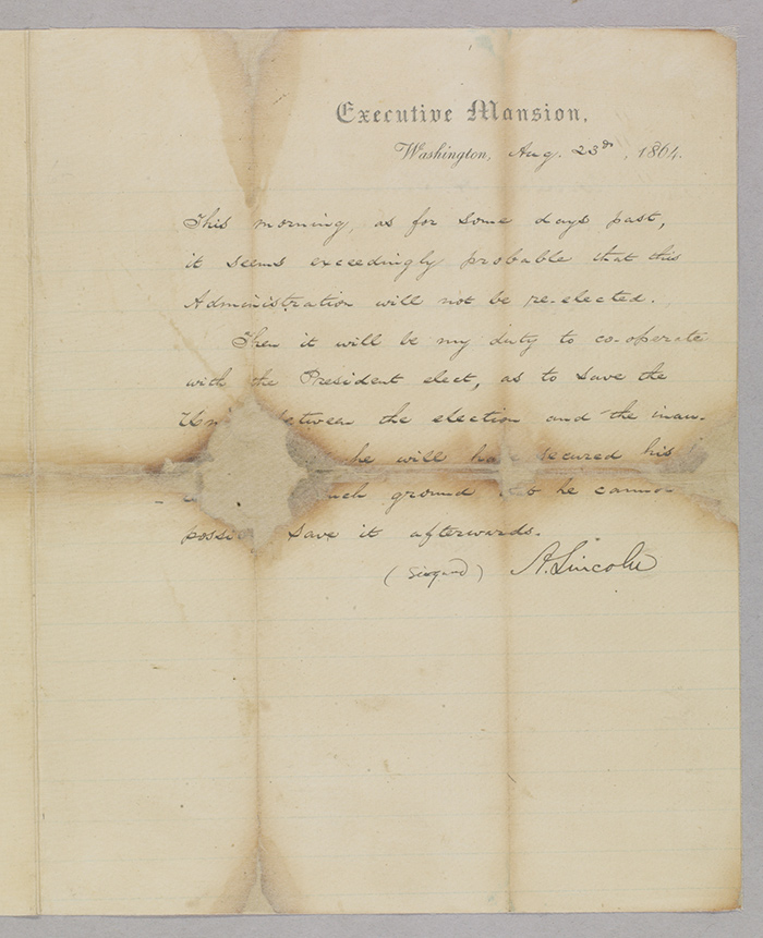 In the summer of 1864, with the Civil War raging into its fourth year, Lincoln knew that his chances for re-election depended on military success. Yet the Union effort had stalled, and he worried about the future of the nation under a new president. He wrote a letter indicating the urgency he felt to save the Union before the next president took office, then folded the paper and pasted it closed. At a cabinet meeting, he instructed his cabinet members to sign it without viewing the contents, a directive they followed. The letter, known as the “Blind Memorandum,” stated: