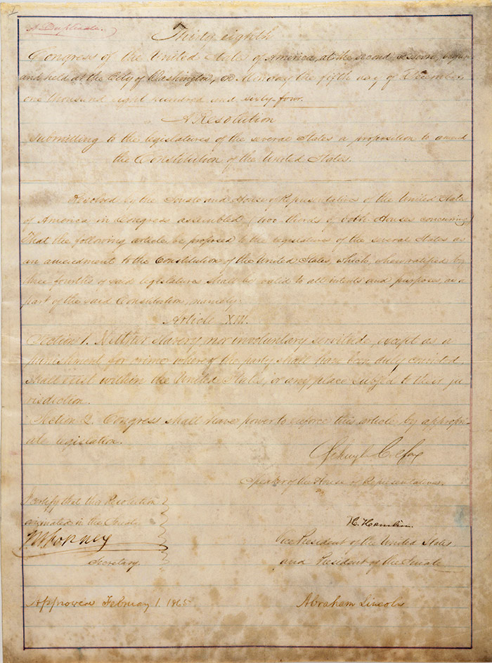 One hundred and fifty years ago, on Jan. 31, 1865, the U.S. House of Representatives passed the 13th Amendment to the Constitution, a resolution ending slavery.