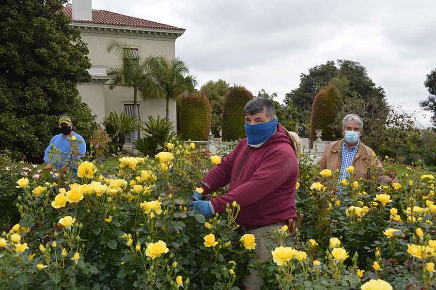 Rose Garden curator Tom Carruth (far right) and gardeners John Villarreal (center) and Noel Aviña (left) maintain physical distancing and wear face masks for added safety while tending the garden during the mandated closure as a result of the COVID-19 pandemic. With some 1,200 varieties of roses coming into full bloom (including the bright yellow floribunda, ‘Sparkle & Shine’), Carruth and his colleagues miss being able to share the beauty of the garden with others. A reopening date has not yet been determined. Photo by Kelly Fernandez.