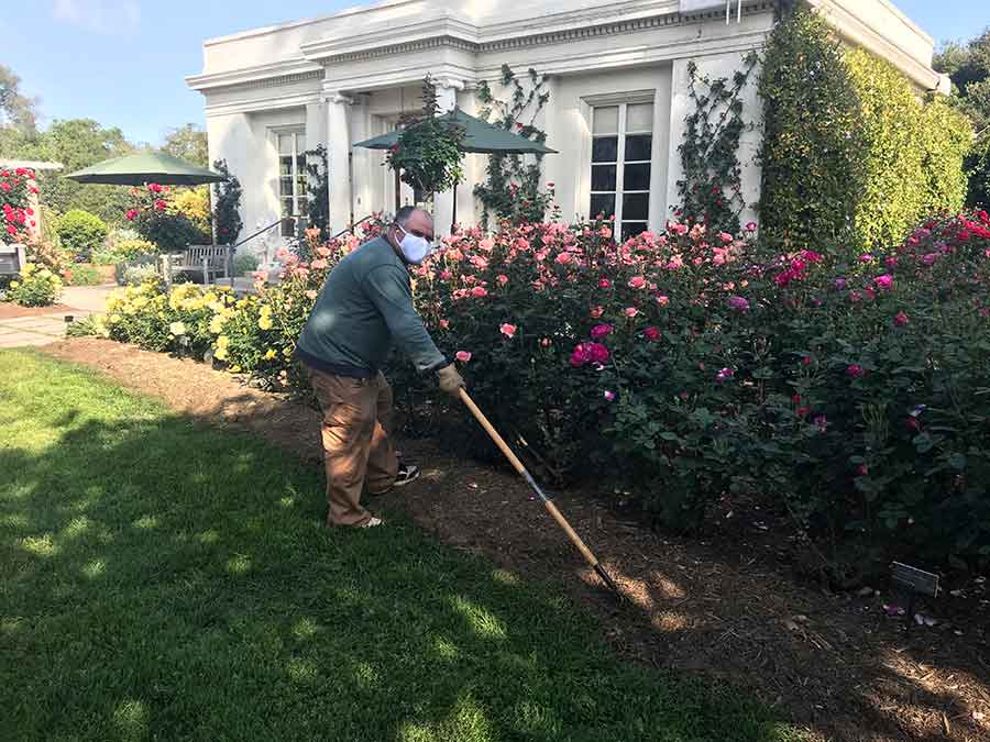 Outside the Rose Garden Tea Room, which is also temporarily closed, gardener Noel Aviña tends a colorful bed of blooms: yellow ‘Sun Flare’ roses, the peachy-pink ‘Jump for Joy’, and magenta ‘Outta the Blue’. Working in the garden, Aviña says, “helps to keep my mind away from the current crisis.” Photo by Tom Carruth.