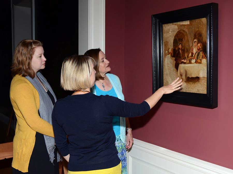 Melinda McCurdy (center) in 2015 with donor Tooey Durning (right) and Christina O’Connell (left), viewing David Wilkie’s Supper at Emmaus at the Huntington Art Gallery. Photo by Lisa Blackburn.